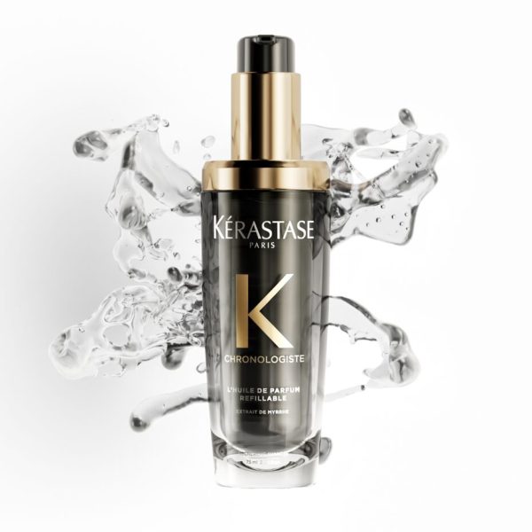 Recarga del Aceite de Parfum Chronologiste de Kérastase, con una infusión de extracto de mirra, es una fragancia capilar en aceite compuesta por una combinación excepcional de notas nobles del mundo de la perfumería fina: rosa de té, maderas claras y almizcle. Delicadamente perfumada, revitaliza y nutre el cabello con solo unas gotas.