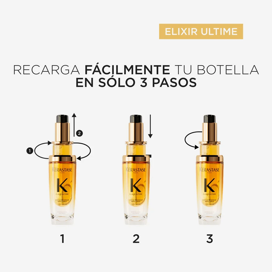 Descubre el lujo definitivo en cuidado capilar con el aceite Kérastase Elixir Ultime, ahora en un formato recargable*. Este aceite, enriquecido con los ingredientes más selectos como la Camelia Francesa, se transforma en un exquisito tratamiento para todo tipo de cabello.