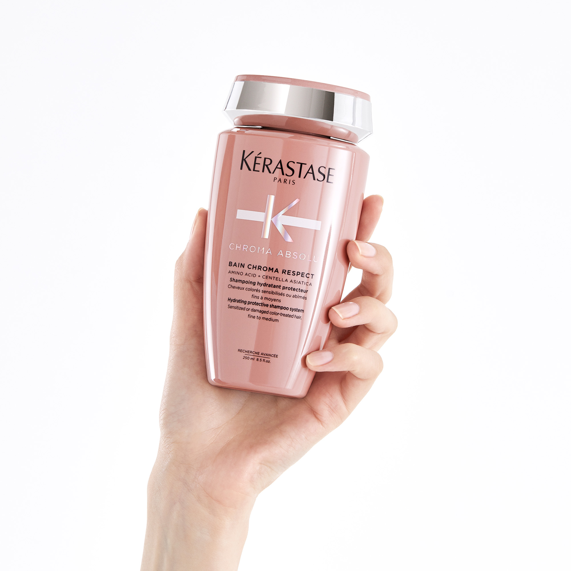 Shampoo Bain Chroma Respect: Nuestro baño protector hidratante sin sulfatos para cabello dañado o sensibilizado por tratamientos de color, fino a medio cuenta con aminoácidos que penetran en la corteza capilar y reconstruyen el cabello de adentro hacia afuera. Además, tiene centella asiática, una planta regenerativa milenaria.