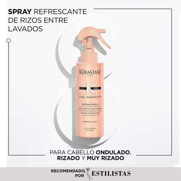 Spray Refresh Absolu: Nuestro spray para refrescar rizos al día siguiente está compuesto por miel de makuna que estimula el aporte de nutrientes, restaurando la vitalidad y el brillo de los rizos secos. Además, cuenta con ceramidas que refuerzan la cohesión de las cutículas para restaurar la suavidad, disciplina y fortaleza; y glicerina que con sus altas propiedades humectantes ayuda a hidratar y distribuir el cuidado de raíz a puntas para una perfecta definición.